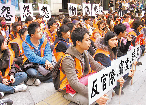 臺(tái)北大學(xué)師生不滿新北市教育局處理霸凌態(tài)度草率,昨號(hào)召百人到市政府前靜坐抗議,要求查明真相。圖片來(lái)源:臺(tái)灣媒體