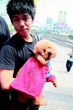 來(lái)自桃園的高中生“小謝”帶著他的貴賓狗一起來(lái)參加游行,他特地為狗兒做了一件超人披風(fēng),上頭寫著“反霸凌”。圖片來(lái)源:臺(tái)灣《聯(lián)合報(bào)》