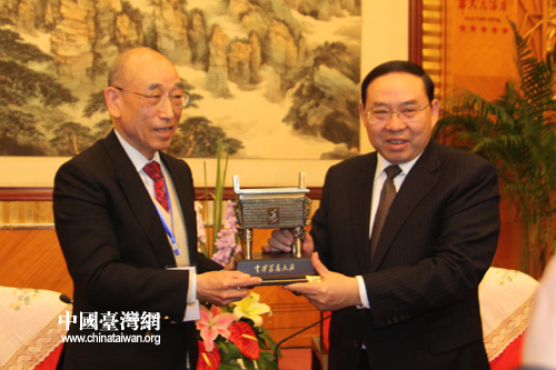 湖南省委副書記梅克保4月2日在長沙會見了以張京育為理事長的中華湖湘文化發(fā)展協(xié)會一行。圖為會見后梅克保(左)向張京育(右)贈送禮物。(中國臺灣網(wǎng) 楊麗 攝)