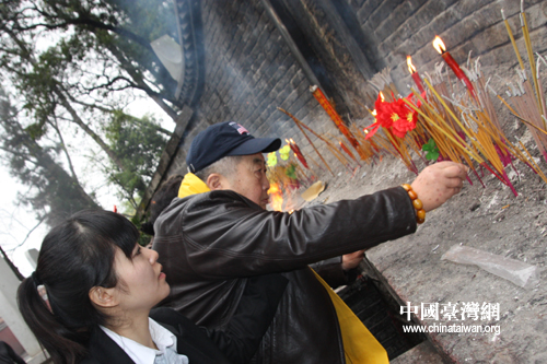 在工作人員的協(xié)助下,81歲的魯燦云老先生從陵園入口一路跋涉至炎帝陵前,虔誠為始祖敬香。(中國臺灣網 楊麗 攝)