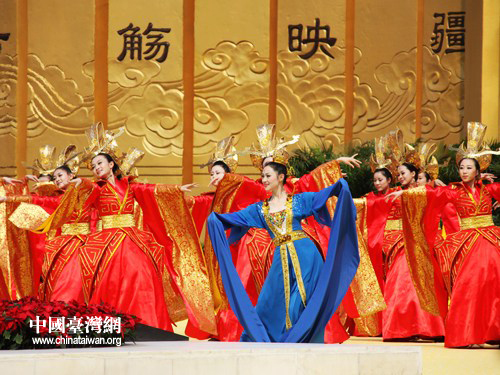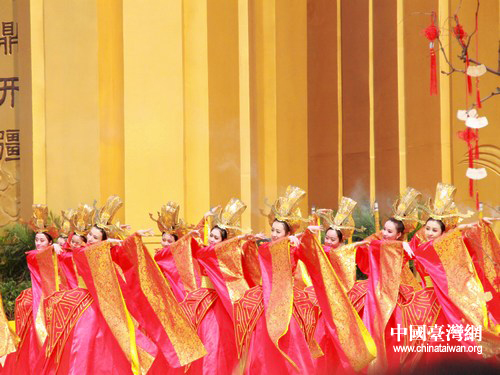 樂舞敬拜環(huán)節(jié),舞者金色高冠、大紅色鑲金邊的華服古色古香。(中國臺灣網(wǎng) 馬迪 攝)
