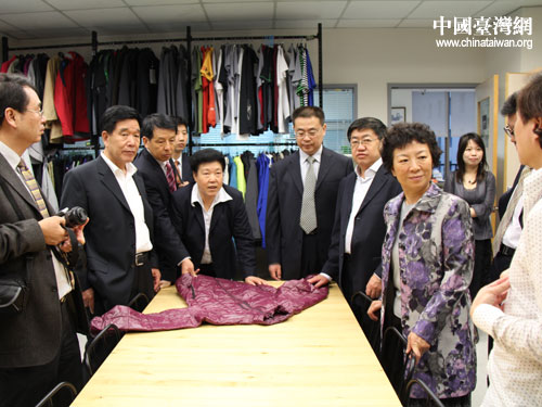 寧夏紡織產(chǎn)業(yè)考察團(tuán)考察臺(tái)灣興采實(shí)業(yè)股份公司研發(fā)的新面料(左二為寧夏自治區(qū)政協(xié)副主席解孟林,右二為寧夏自治區(qū)黨委副秘書(shū)長(zhǎng)、臺(tái)辦主任張秀燕)。圖片來(lái)源:寧夏臺(tái)辦