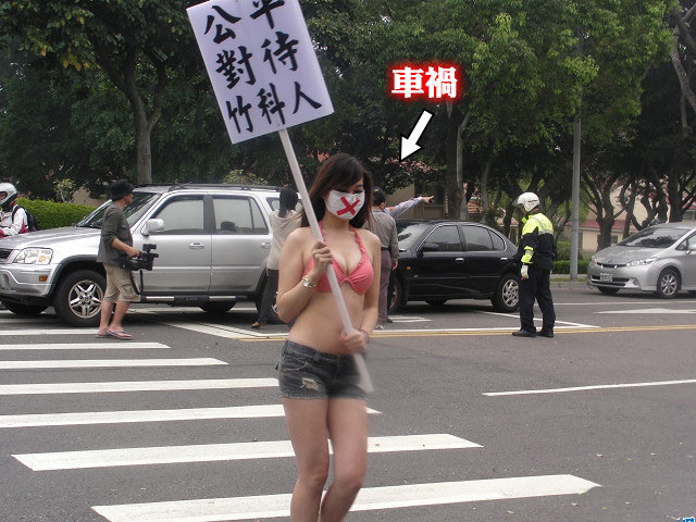 中國(guó)臺(tái)灣網(wǎng)4月14日消息 據(jù)臺(tái)灣媒體報(bào)道,臺(tái)灣新竹科學(xué)園區(qū)今(14)日上午上班高峰時(shí)間,8名身材惹火的比基尼辣妹舉著抗議牌子逛大街。疑因看辣妹分神,現(xiàn)場(chǎng)造成一起追撞車禍,目前事故已排除。