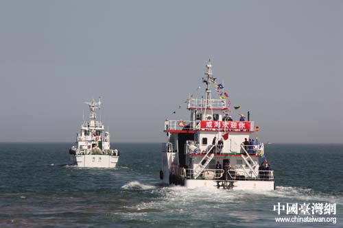 旅游船、海事船等組成的艦艇編隊(duì)駛向劉公島。(中國(guó)臺(tái)灣網(wǎng) 劉海偉 攝)