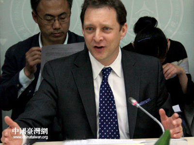 《大陸和臺灣經(jīng)濟互相開放的影響》作者之一的榮大聶(Daniel H.Rosen)在座談會上發(fā)言。(中國臺灣網(wǎng) 高斯斯 攝)