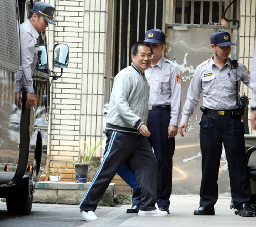 臺(tái)灣“高等法院”21日開(kāi)庭審理“二次金改”案,傳訊被告出庭,陳水扁(前中)搭乘警備車準(zhǔn)時(shí)出庭。