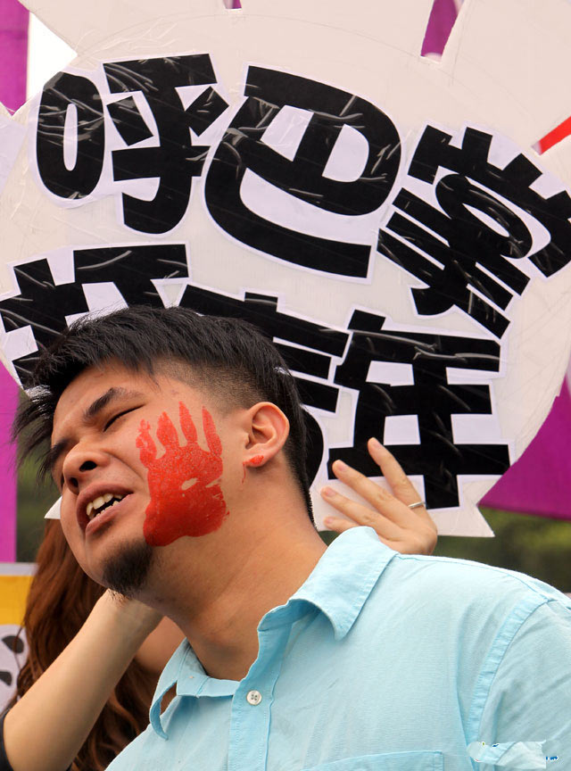 中國臺(tái)灣網(wǎng)4月22日消息 據(jù)臺(tái)灣媒體報(bào)道,臺(tái)灣反貧困聯(lián)盟、臺(tái)灣勞工陣線、社會(huì)住宅聯(lián)盟、卡債受害自救會(huì)等團(tuán)體,今(22)日在凱達(dá)格蘭大道上抗議,號(hào)召弱勢(shì)族群及青年世代參與反貧困五一大游行。青年代表今日也在現(xiàn)場(chǎng)上演行動(dòng)劇,5個(gè)年輕人被大型道具手呼巴掌,每個(gè)巴掌分別代表債務(wù)、學(xué)貸、派遣、過勞、失業(yè)等。