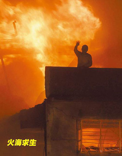 一名男子受困頂樓,顧不得濃煙嗆人,向警消揮手求救。圖片來(lái)自網(wǎng)絡(luò)