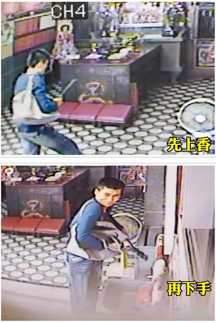 林煒強(qiáng)先點(diǎn)香拜拜求心安(上圖);破壞賽錢箱時(shí),賊頭賊腦觀察周邊動(dòng)靜(下圖)。圖片來(lái)自網(wǎng)絡(luò)