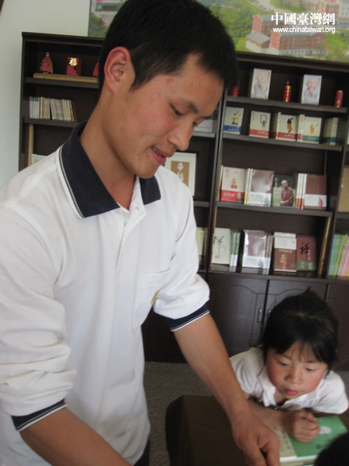什邡安心站的志愿者鄧兵向記者介紹法鼓山援助四川重建情況。(中國臺灣網(wǎng) 朱毅 攝)