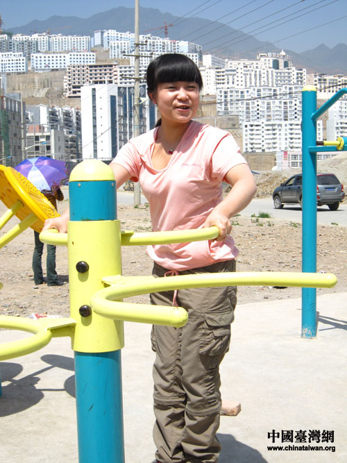 美麗的漢源新縣城重建速度與質(zhì)量讓人驚嘆,文化館、學(xué)校、體育館、醫(yī)院中現(xiàn)代化設(shè)施一應(yīng)俱全,漢源人民文體生活更加豐富多彩。圖為網(wǎng)絡(luò)媒體行工作人員在試用健身器械。(中國(guó)臺(tái)灣網(wǎng) 朱毅 攝)
