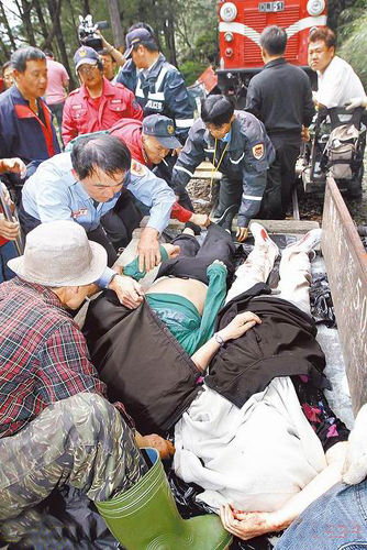 魂斷阿里山,因傷亡人數(shù)眾多,救難人員臨時用臺車充當(dāng)擔(dān)架,將罹難者運送下山。圖片來源:臺灣媒體