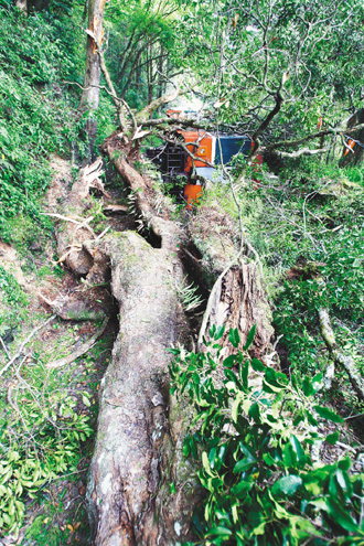 阿里山小火車翻覆意外,經(jīng)現(xiàn)場勘查懷疑森氏櫟是白蟻與真菌蛀食枝干,導(dǎo)致枝干斷裂擊中小火車。圖片來源:臺(tái)灣《聯(lián)合報(bào)》