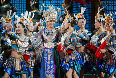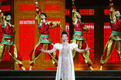 大陸著名歌唱家宋祖英(左4)8日在臺(tái)北小巨蛋舉行演唱會(huì),穿著華麗的衣裳帶來(lái)精彩演唱,歌聲高亢動(dòng)人。圖片來(lái)源:臺(tái)灣媒體