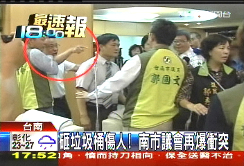 據(jù)報(bào)道,臺(tái)南市議會(huì)今天審查市府總預(yù)算,民進(jìn)黨總召曾王雅云跟其它黨團(tuán)議員因?qū)彶榉绞接袪?zhēng)議,發(fā)生激烈口角。未料無黨籍議員曾順良順手丟出一只垃圾桶,砸傷了曾王雅云。這突如其來的動(dòng)作讓大家先是一怔,而后民進(jìn)黨議員極大不滿,紛紛狂喊“你給我出來”,欲對(duì)曾順良群毆為總召“報(bào)仇”。曾王雅云對(duì)同黨議員進(jìn)行喝止,這場(chǎng)沖突才沒有升級(jí)。