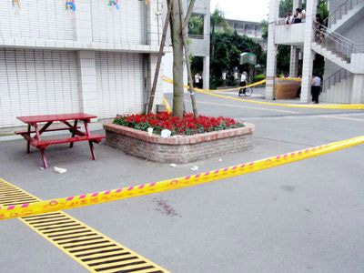 臺(tái)灣苗栗縣仁德醫(yī)校12日放學(xué)后遭4名歹徒持槍闖入,歹徒以槍托敲擊學(xué)生頭部時(shí)發(fā)生走火,造成3名學(xué)生受傷送醫(yī),警方案發(fā)后在校內(nèi)拉起封鎖線。圖片來(lái)源:臺(tái)灣媒體