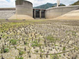 曾文水庫(kù)最高水位227米,溢洪道是211米,水閘門(mén)最低的地方是206米,12日水位只剩188米。在水位計(jì)附近有大批浮覆地露出水面,持續(xù)高溫日照下,地表嚴(yán)重龜裂,干旱情景令人怵目驚心。