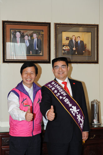 臺(tái)灣周大觀文教基金會(huì)負(fù)責(zé)人周進(jìn)華為陳光標(biāo)披上綬帶并合影留念。圖片由陳光標(biāo)本人提供