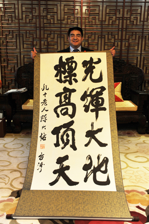 周進(jìn)華帶來國民黨榮譽(yù)主席連戰(zhàn)的老師陳大絡(luò)給陳光標(biāo)的題詞。圖片由陳光標(biāo)本人提供