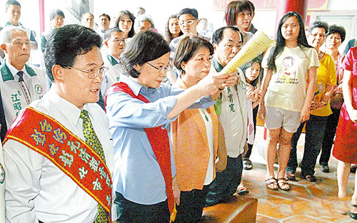 參拜吸票,蔡英文到彰化元清觀(guān)參拜,親拿祝禱文獻(xiàn)給玉皇大帝。圖片來(lái)源:臺(tái)灣媒體