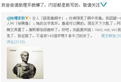李敖在首篇博文中表示,古人“誤落塵網(wǎng)中”,彷佛預(yù)見(jiàn)了網(wǎng)中有塵。我認(rèn)識(shí)一位可愛(ài)的女人叫“徐開(kāi)塵”,她的名字真好。塵是可以開(kāi)的。現(xiàn)在天下大亂了,阿貓阿狗都會(huì)舞文弄墨了,“康熙”都低級(jí)趣味了。好吧,如凱撒所說(shuō):Veni, vidi, vici.我來(lái)了、我看見(jiàn)了、我征服了。不是寫140個(gè)字嗎?拿牛刀的來(lái)了。