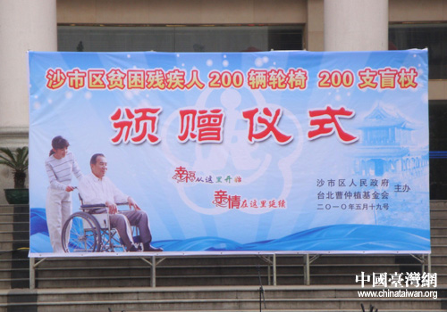 中國(guó)臺(tái)灣網(wǎng)5月20日荊州消息 5月16日上午,湖北荊州市沙市區(qū)政府、臺(tái)北曹仲植基金會(huì)在荊州舉行了隆重的輪椅頒贈(zèng)儀式,共有6個(gè)鄉(xiāng)鎮(zhèn)、5個(gè)街道的400名殘疾人受惠。