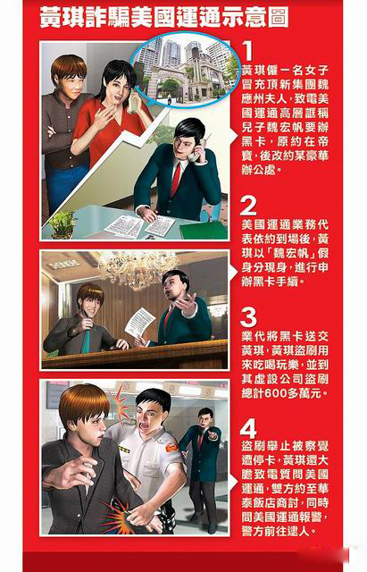 黃琪詐騙美國(guó)運(yùn)通示意圖。圖片來(lái)自網(wǎng)絡(luò)