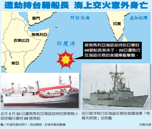 中國(guó)臺(tái)灣網(wǎng)5月29日消息 據(jù)臺(tái)灣《聯(lián)合報(bào)》報(bào)道,遭索馬里海盜劫持一年多的臺(tái)灣漁船“日春財(cái)68號(hào)”,今年談判稍有進(jìn)展,近日卻傳來(lái)不幸消息。臺(tái)灣外事主管部門昨天(28日)指出,5月20日美國(guó)軍艦執(zhí)行反海盜任務(wù)時(shí),遭劫持的“日春財(cái)68號(hào)”被海盜當(dāng)作攻擊母船(人質(zhì)船),與美軍艦交火,臺(tái)籍船長(zhǎng)吳來(lái)于在雙方交火中身亡。