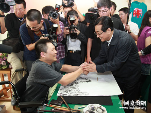 趙洪祝在高雄殘障之家與殘障輪椅畫家交談。(浙江臺辦王健 攝)