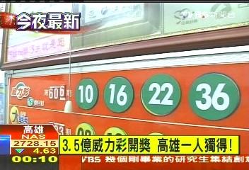 高雄市一彩民昨晚獨(dú)中3.5億威力彩頭獎(jiǎng)。圖片來(lái)源:臺(tái)灣TVBS電視臺(tái)