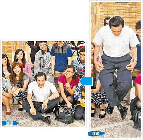 昨日,馬英九到臺(tái)中靜宜大學(xué)時(shí)心血來潮,在與同學(xué)合影時(shí)表演“立定、彈跳、坐地”(立定跳遠(yuǎn))。只見馬英九往上跳、騰空盤腿,接著“咚”地一屁股坐在地上,身邊大學(xué)生們看到61歲的馬英九動(dòng)作依然靈活,不禁“哇”地驚呼起來。