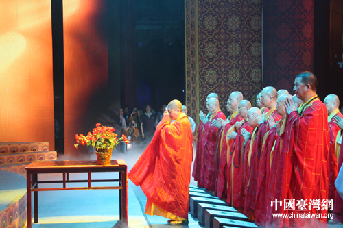 開幕式后,與會嘉賓一起欣賞了大型文藝演出“語默動靜之夜”。這場以出家人為主要演員、僧俗同臺的表演,由臺灣少數(shù)民族歌曲《我們都是一家人》、鼓樂表演《石鼓名山》、古琴演奏《語默動靜》、武術(shù)表演《南少林雄風(fēng)》等14個節(jié)目組成,演繹精彩、場面宏大,獨(dú)具特色。(記者 楊麗)