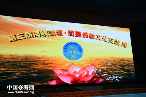 “第三屆海峽論壇·閩臺佛教文化交流活動周”9日晚間在福州開幕,圖為開幕式背景板,蓮花盛放在海峽間。(中國臺灣網(wǎng) 楊麗 攝)