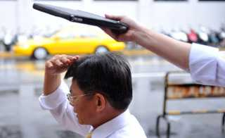 前高雄縣長楊秋興離開臺灣“高等法院”時遇上午后雷陣雨,幕僚用平板計算機為他遮雨,形成有趣景象。圖片來源:臺灣“今日新聞網(wǎng)”