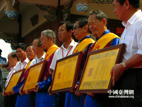 湄洲媽祖祖廟董事會(huì)將牌匾授予臺(tái)灣148家宮廟代表。(中國(guó)臺(tái)灣網(wǎng) 馬迪 攝)