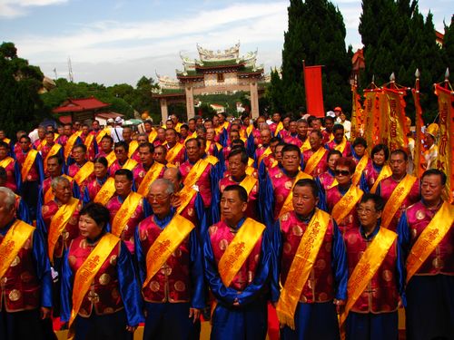 鐘鼓手嚴(yán)鼓三通之后,祭典儀式于上午9時(shí)正式開(kāi)始。在響徹祖廟的禮炮聲中,儀仗隊(duì)、儀衛(wèi)隊(duì)各執(zhí)清道旗、警蹕牌、敕封牌、封號(hào)旗、日月牌等緩步就位,立于廣場(chǎng)兩側(cè)。三位主祭人率領(lǐng)148家媽祖宮廟信眾代表,統(tǒng)一身著藍(lán)色袍服,肩披綬帶,列隊(duì)進(jìn)入祖茂的圣旨門(mén)廣場(chǎng)。向湄洲媽祖金身神像行三拜九叩禮,并依序舉行迎神上香、誦讀祝文、三獻(xiàn)之禮、送神禮成等祭典程序,虔誠(chéng)祝禱兩岸心手相連、和平發(fā)展。