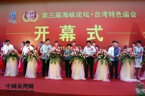 第三屆海峽論壇重要活動(dòng)之一的臺(tái)灣特色廟會(huì)今天下午舉行開幕式。圖為參加活動(dòng)領(lǐng)導(dǎo)為開幕式剪彩。(中國臺(tái)灣網(wǎng) 于斯文 攝)