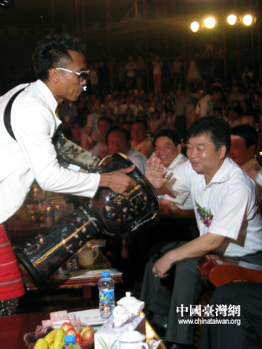 臺灣原住民樂隊走下舞臺,與觀眾互動,合作演出。(中國臺灣網 馬迪 攝)