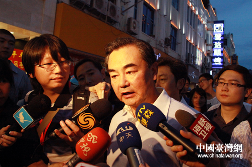 6月12日下午,正在廈門出席第三屆海峽論壇的國務(wù)院臺辦主任王毅參觀了在廈門市中山路舉行的臺灣特色廟會。圖為王毅接受兩岸媒體采訪。(中國臺灣網(wǎng) 王偉 攝)