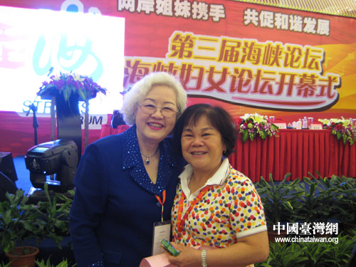 姐妹情深:臺(tái)灣女企業(yè)家協(xié)會(huì)創(chuàng)會(huì)理事長(zhǎng)馬愛(ài)珍和廣西金嗓子集團(tuán)主席江佩珍合影(中國(guó)臺(tái)灣網(wǎng) 李丹 攝)