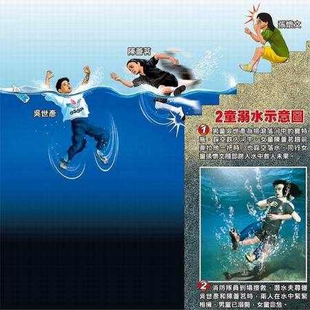 近10時(shí),突然有一陣風(fēng)將吳世彥的飲料瓶吹落河中,吳急忙追著瓶子跑,伸手要去撿,但風(fēng)把瓶子吹得更遠(yuǎn),吳伸長手臂去撈,卻撈不到,往前一走跌落水中,一旁的陳薈茗立刻趨前想拉住吳世彥。陳薈茗順著階梯走下去,沒想到走沒幾階,手還沒勾到吳世彥,自己也跌入水中,隨即在水中掙扎,緊張大喊救命。