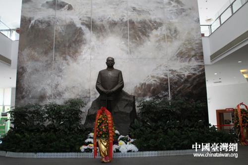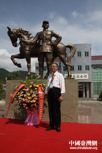 謝晉元將軍的兒子謝繼民在父親銅像前獻(xiàn)花籃。(中國臺灣網(wǎng) 馮江 攝)