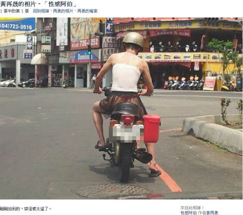 拍到“性感阿伯”的是臉書用戶“黃再晟”。他23日在馬路上發(fā)現(xiàn)“性感阿伯”,立刻拍下來上傳到臉書(Facebook),直呼“剛剛拍到的,穿這樣太猛了!薄罢嫒苏媸掠H眼目睹,當(dāng)下震驚萬分!”據(jù)其它網(wǎng)友指出,拍照地點在彰化市中山路2段。