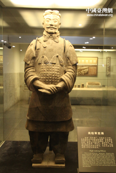 高級(jí)軍吏俑——頭戴鹖冠,身材高大魁梧,氣質(zhì)出眾超群,具有大將風(fēng)度。(中國(guó)臺(tái)灣網(wǎng) 楊永青 攝)