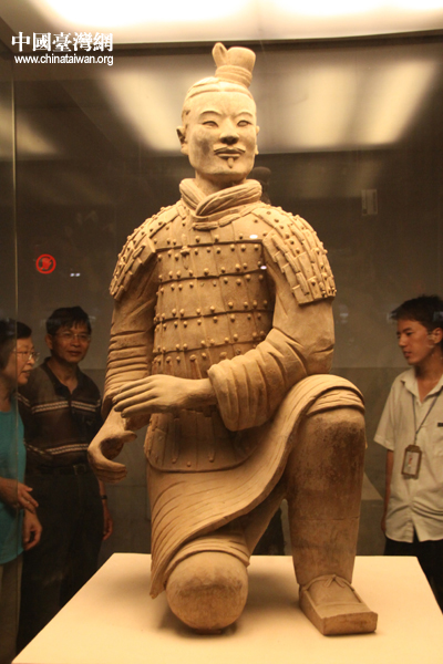 跪射俑——身穿戰(zhàn)袍,外披鎧甲,頭頂左側(cè)挽一發(fā)髻,腳登方口齊頭翹尖履,左腿蹲曲,右膝著地,上體微向左側(cè)轉(zhuǎn),雙手在身體右側(cè)一上一下作握弓狀,表現(xiàn)出一個(gè)持弓的單兵操練動(dòng)作。(中國(guó)臺(tái)灣網(wǎng) 楊永青 攝)
