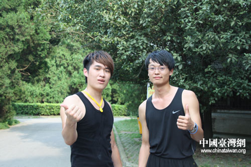 臺灣逢甲大學(xué)李連捷和中國地質(zhì)大學(xué)霍志強(qiáng)在武漢大學(xué)籃球場過了一把籃球癮(中國臺灣網(wǎng) 李丹 攝)