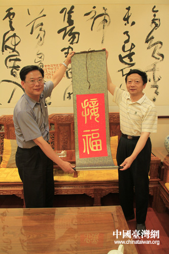 宋慶齡基金會副秘書長喬健與臺灣十大杰出青年辦公室主任彭銘淵交換禮物。(中國臺灣網(wǎng) 趙婧 攝)