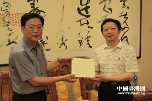 宋慶齡基金會副秘書長喬健與臺灣十大杰出青年辦公室主任彭銘淵交換禮物。(中國臺灣網(wǎng) 趙婧 攝)