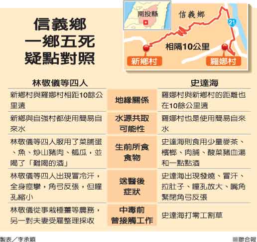 死亡的5人同鄉(xiāng)不同村,4天前離奇死亡的林敬儀夫婦住新鄉(xiāng)村,另一對夫婦田福榮受林雇用,在林家用餐后回自強(qiáng)村住處,4人先后死亡,都出現(xiàn)嘴角微翹“詭異的笑臉”死法。
