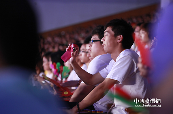 面對(duì)如此精彩的演出和眾多云集的明星大腕,青年們?nèi)滩蛔∧贸鲎约旱南鄼C(jī)拍照留念。(中國(guó)臺(tái)灣網(wǎng) 普燕 攝)